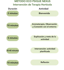 - Cuidado de las plantas: incorporar la rutina de mantenimiento de las plantas es una estrategia indispensable, especialmente para personas con desórdenes mentales o adolescentes en riesgo. Esta tarea permite a los participantes ser más conscientes de sus necesidades y las necesidades de las plantas. Muchas veces le damos a los participantes plantas que necesitan “ser recuperadas”. Esto activará la capacidad innata de sanación que tenemos todas las personas.